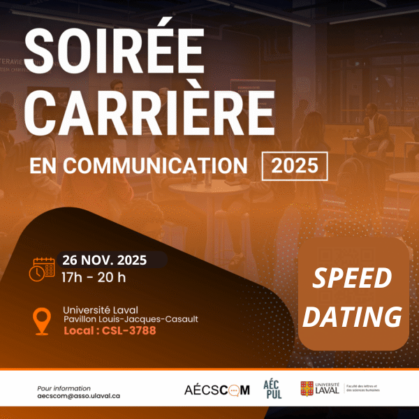 Le mercredi 26 novembre 2025, de 17h à 20h, à la salle 3788, au Casault, on t’invite à une soirée unique sous forme de speed dating professionnel.